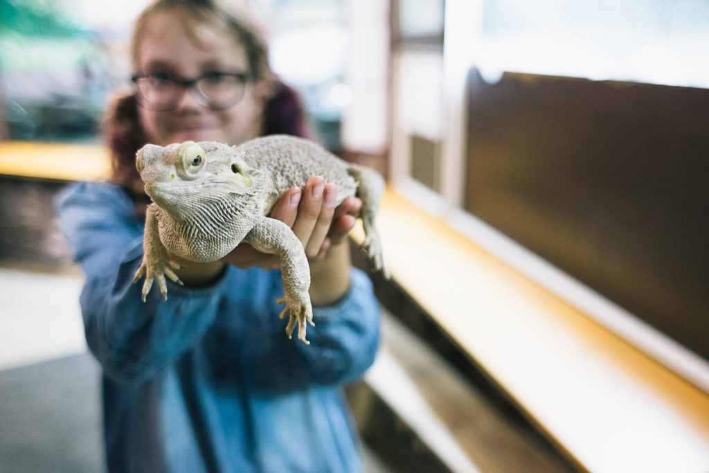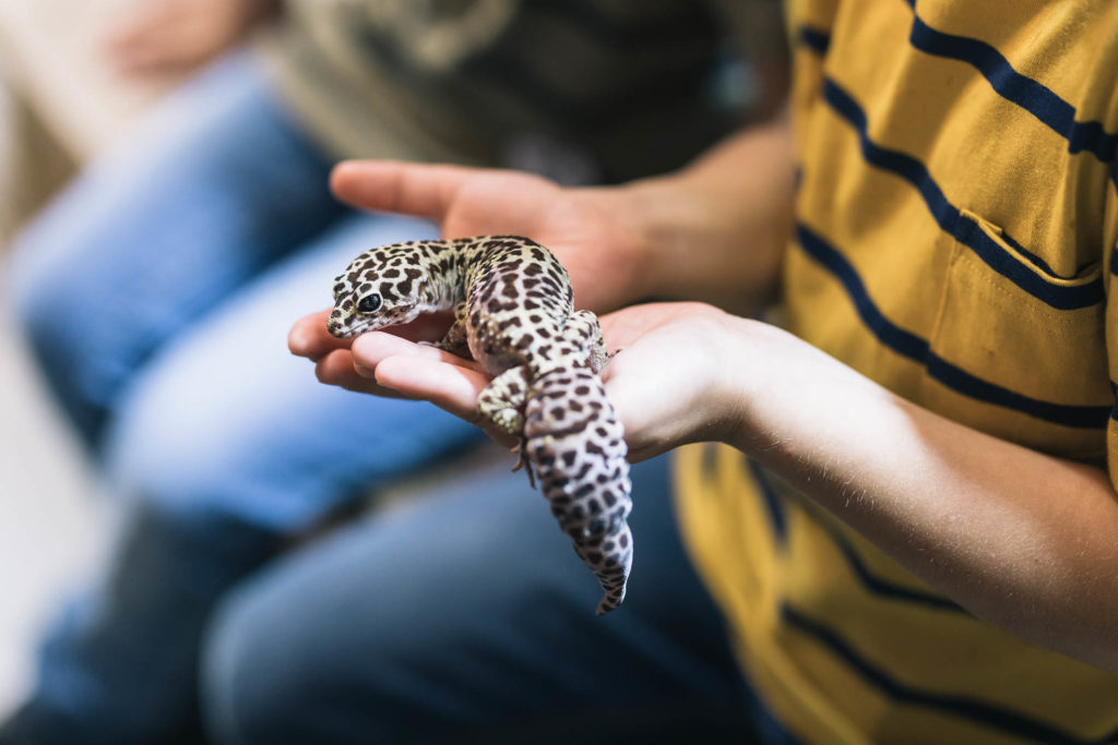 The common leopard gecko is one of the most common geckos kept as pets. It is a nocturnal gecko, so if you have come to say hello to Sylvi and she is nowhere to be seen at that moment, she is probably taking a nap. For their part, central bearded dragons are diurnal animals that are active during the day, so Papu might be easier to spot moving about its terrarium.