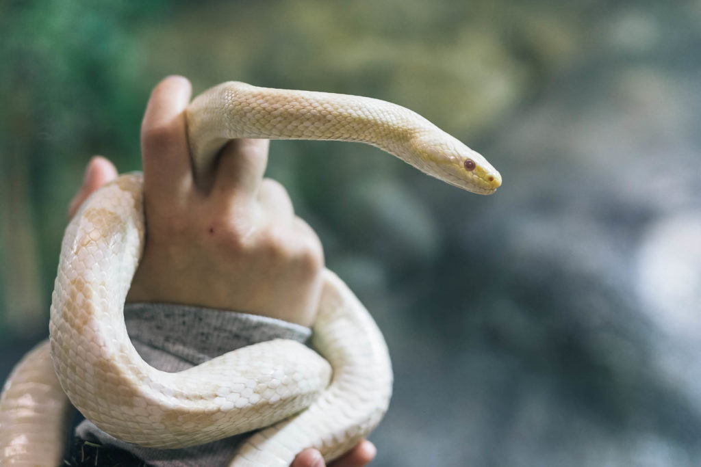 All animals shed their skin, us humans included. However, snakes are one of the few animals that shed their entire skin at once. Snakes shed their skin multiple times a year, and young snakelets may shed their skin a few times a month as they grow. Before the skin comes off, the colour of the snake dims for about a week. This is caused by moisture collecting underneath the moulting skin. The snake’s eyes are also dimmed, as the skin also covers those.