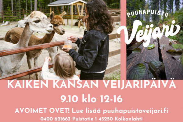 Piristystä lokakuuhun, tervetuloa syksyiseen tapahtumapäivään Veijariin 9.10 klo 12-16! Luvassa mm. Safrin frisbeegolfkisat eri sarjoissa (junnu-ja höntsäsarjoihin ilmoittautuminen paikanpäällä), kotieläinpihan eläimiä tavattavissa, tuotemyyntiä/esittelyä eri yritysten toimesta: Lampaamo, Me&I, Ommellen Clothing, Äärelläsi, Ekokampaamo Minna Waris, Fribatarvike. Onnenpyörä, makkara- ja virvokemyyntiä. Arpajaiset, kaikkien kävijöiden kesken arvotaan Puuhapuiston ensi kesän kausikortti ja Safrin kiekkopaketti! Alueelle VAPAA PÄÄSY, otathan kuitenkin huomioon, että puiston kesätoiminnot ovat jo talviteloilla.
